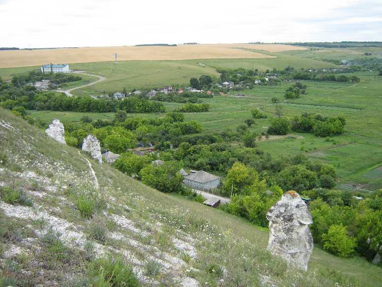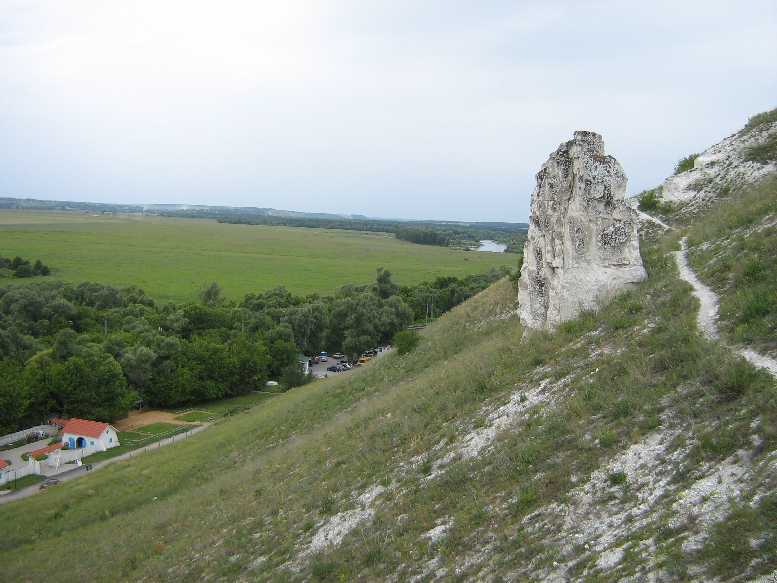 Так к 13:00 мы были уже на месте. И попали на территорию этнографического музея - подворья переселенцев с Украины. На фото домик с красной крышей. Поднялись по склону меловой горы к подножию крепкого мелового столба (диво). А дальше виднеется река Дон.