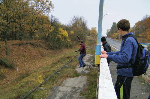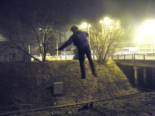 Сегодня походили до половины десятого. Оля начала проходить 5 метровую стропу(третья тренировка), Вова подбил всех прыгать. Я боролся на 15 метрах, сегодня не очень успешно.