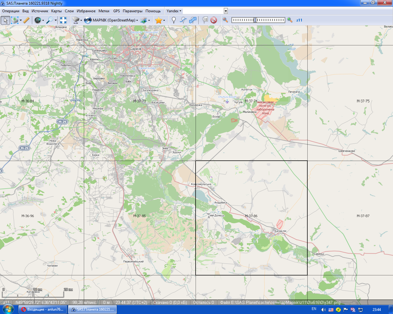 Кстати, если интересно, написал мелкую утилитку, которая по номенклатуре километровки гш (пока только километровки, если надо могу добавить другие номенклатуры) создает файл выделения (.hlg) для SAS планеты. Т.е. определяет координаты границ листа, переводит их в WGS84 и пишет в файл в нужном формате. Т.е. потом остается только в меню выбрать "Операции с выделенной областью -> Загрузить из файла" и дальше уже загружать и склеивать.
