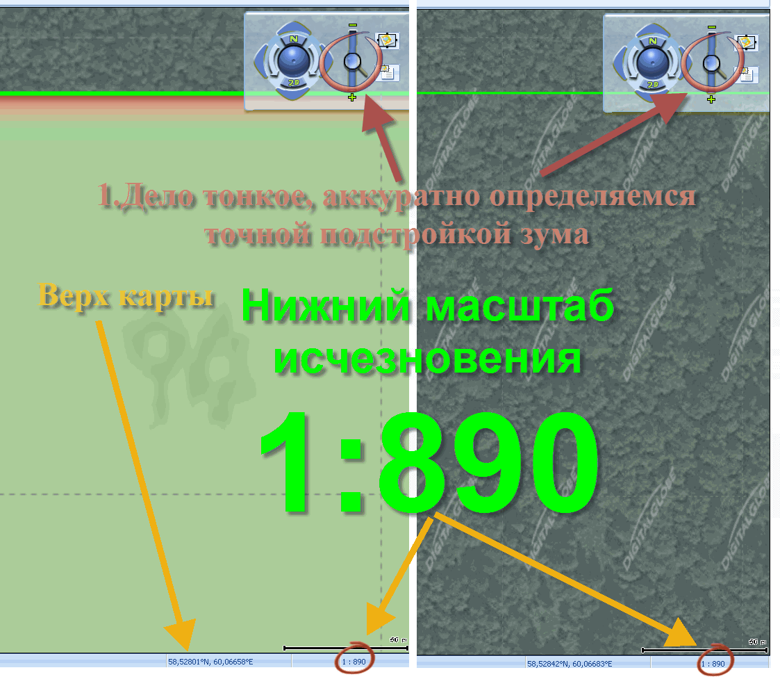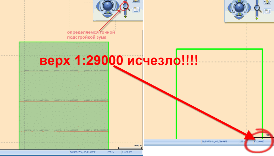 Лучше всего поступить так, скажем в верхней части карты аккуратно поймать момент появления (на скрине той карты 1:28000) и чуток назад, до исчезновения (на скрине 1:29000) .