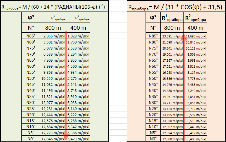Рприбора=M/(31/COS(РАДИАНЫ(широта))+31,5)