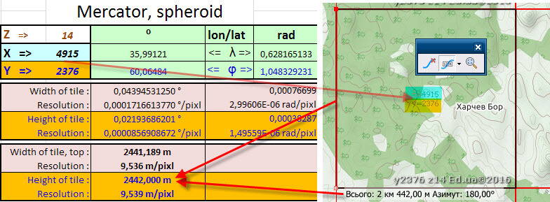Итак, в конечном итоге получаем формулу зависимости разрешения в угловых секундах на пиксель от широты и масштабного уровня: