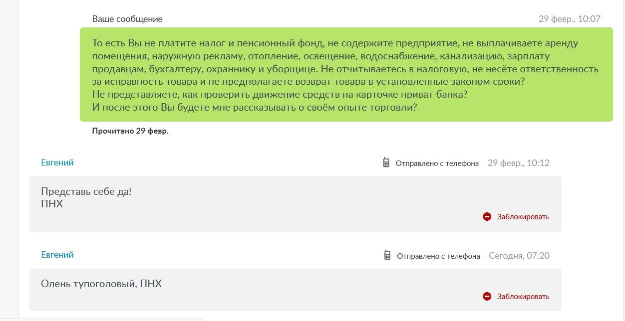Торговля идёт хорошо, потому, что в любой спорной ситуации посылаю всех НАХ.
