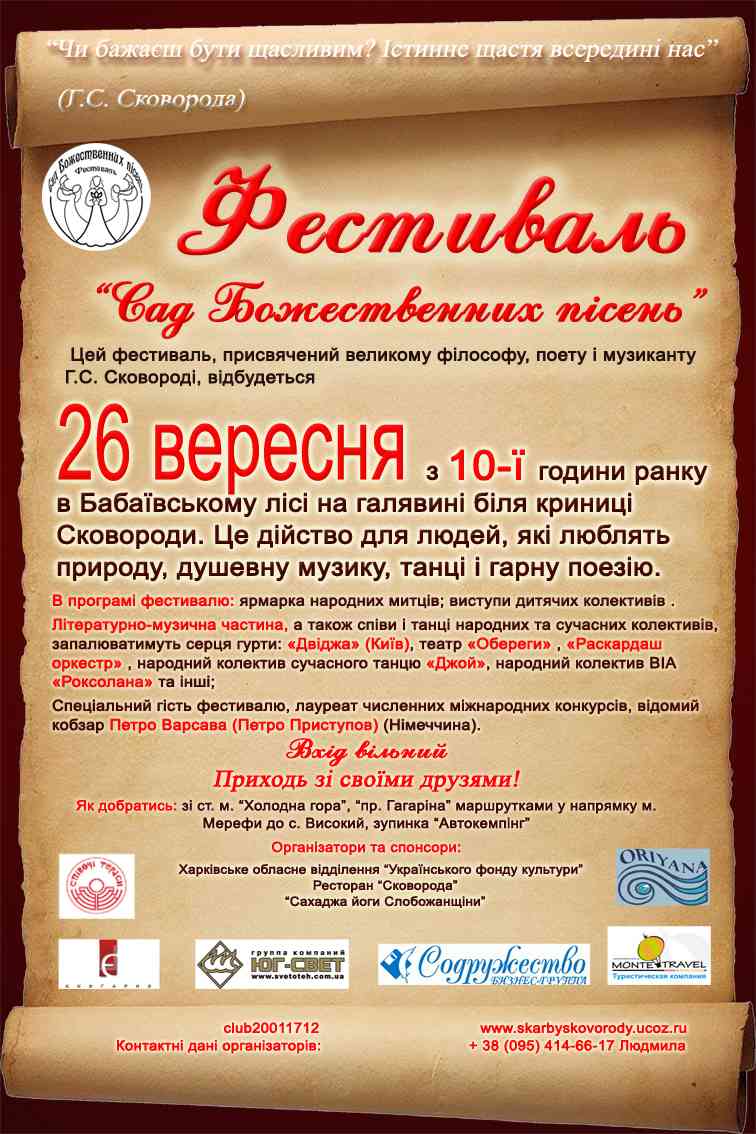 Этот фестиваль, посвященный великому философу, поэту и музыканту Г.С.Сковороде, начнется в 10 утра 26 сентября в Бабаевском лесу на поляне возле источника Сковороды.