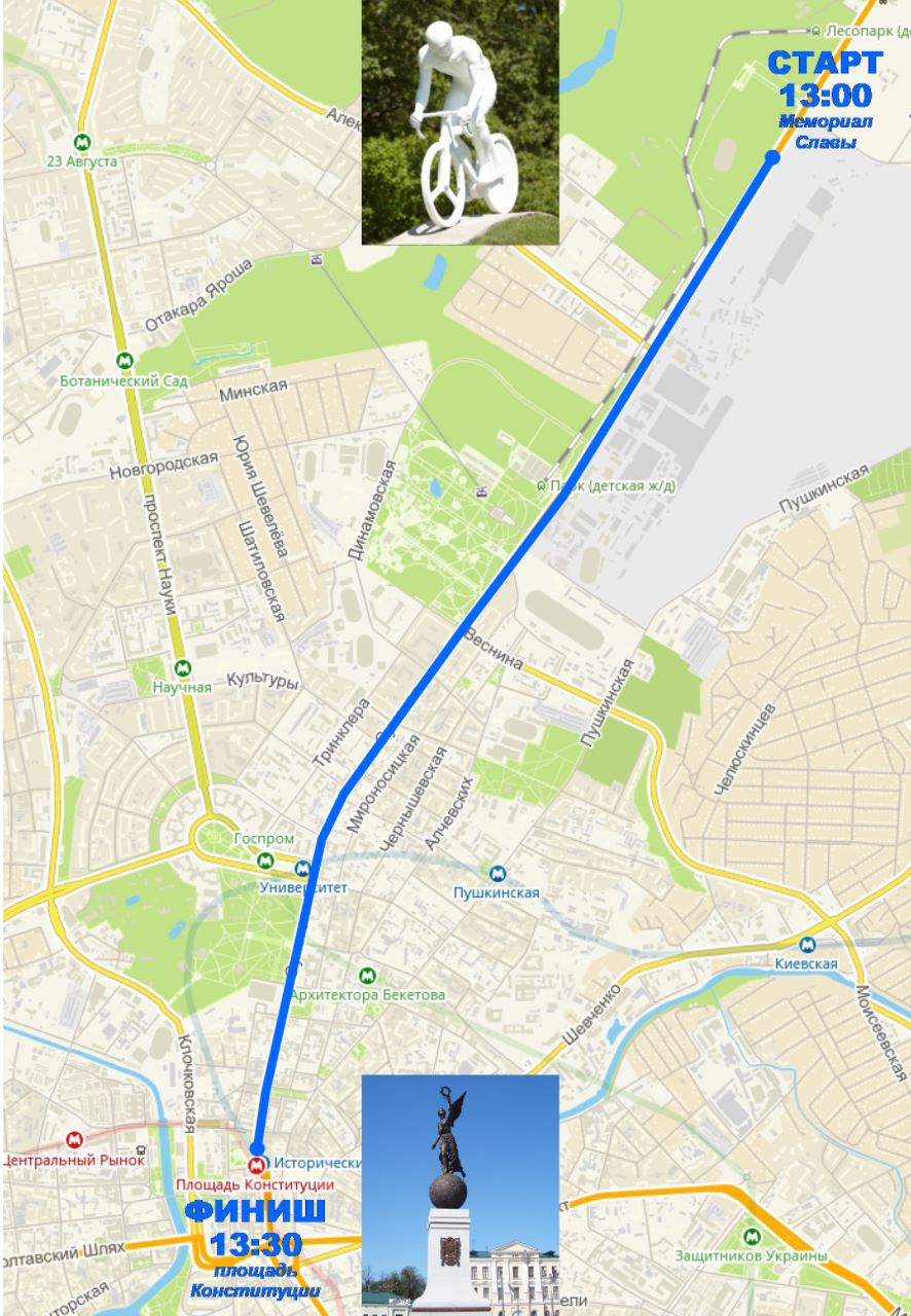 Маршрут: Белгородское шоссе от памятника Велосипедисту по ул. Сумская до пл. Конституции в общем транспортном потоке.