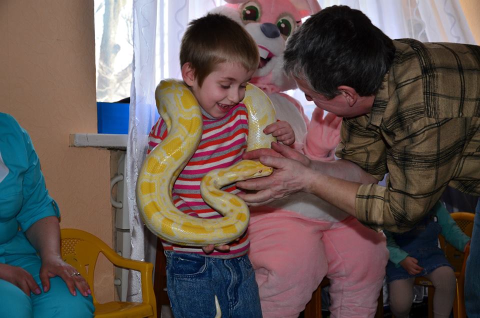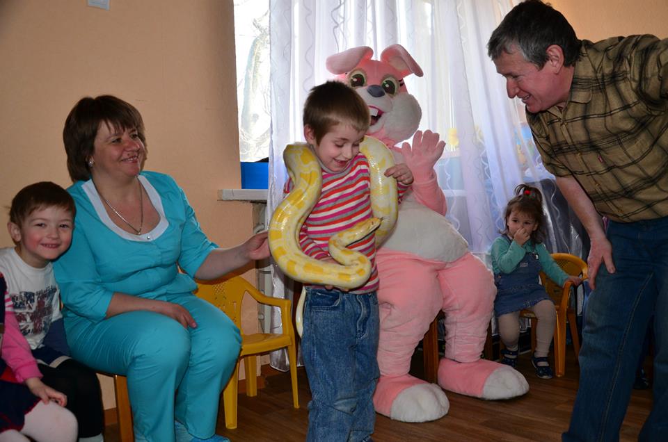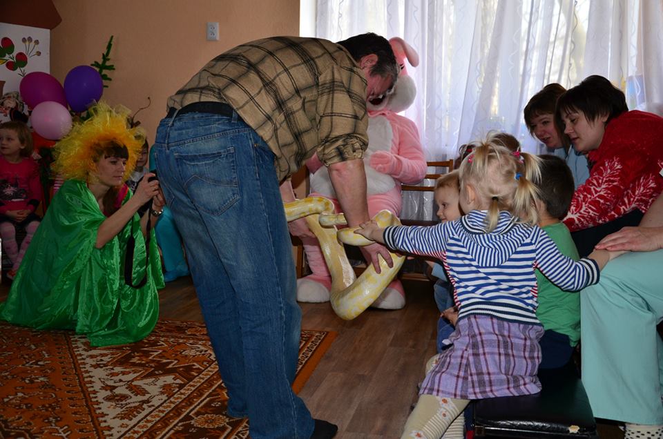 И снова мы побывали в гостях у малышей. Уже почти как к себе домой приезжаем - и нянечки все знакомые, и детки тоже. В это раз, не смотря на долгие перепетии перед поезкой, все прошло на удивление не то слово как замечательно. Чем меньше народа - тем продуктивнее таки выходт поездка и для взрослых и для детей. Пока аниматоры (Наташа и Оксана) забавляли малышей - Лена, Сергей и Валерий пофасовали подарки для деток. Всем всего хватило :мальчишки получили разукрашки, а девчонки- разукрашики и заколочки. Дети от мероприятия были просто в восторге сегодня. Это первый питон в их жизни, про Лорика я вообще молчу! К змеюке сначала отнеслись с подозрением, как к малоизученному элементу, а потом раззнакомились и понеслось) Ребята пофоткали малышню, я закажу фото и в следующий раз передадим их в личные дела к ребятне на память.