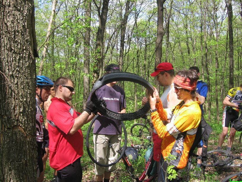 может оставлять 1го, 2го, 3го замыкающего с каждым проколом? ведь всё равно делаются плановые остановки (магазины, шашлык и т п). Допустим сегодня ехали мы довольно быстро и легко проходили эту дистанцию, но из за 3х или 4х проколов (а статистика при езде по колючкам группы в 30 человек наверное такая и есть - 1 из 10ти) -- мы отстали от графика. Мне кажется имеет смысл придумать (или перенять) организацию поездки, при которой основная группа не будет ждать тех., кто прокололся или поломался а ехать дальше - а ждать уже на запланированных остановках..