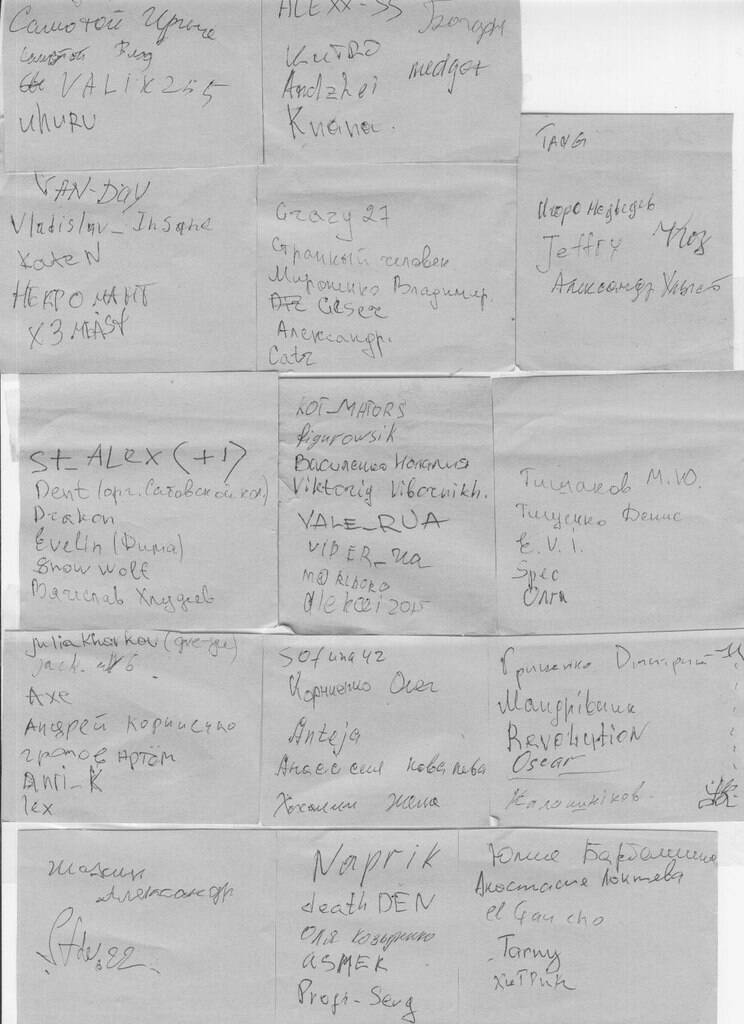 Выкладываю фото листиков с никами и фамилиями, сравнивайте со списком регулировщиков в первом посте и пишите кого пропустили, многое не можем расшифровать.