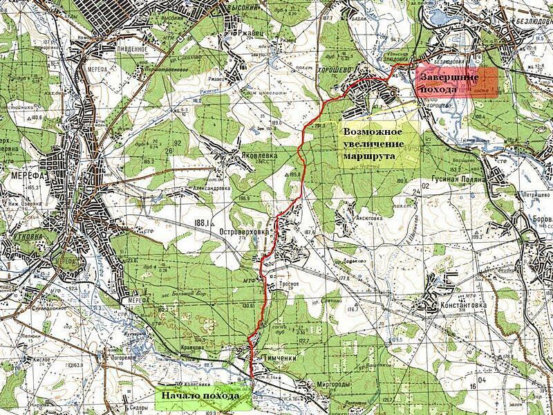 4. Теперь сам маршрут: С Южного вокзала есть электричка на Змиев через Мерефу отправляется в 9 07 прибывает 10 22 на Оп 14 км (Тимченки) далее через посёлок по трассе в Остросверховку потом через поле в лес до посёлка Хорошево. Потом как решим - можно с Хорошево в Харьков ехать на маршрутке или пойти дальше (3 км) до ст. Удянская на электричку. Во всех населённых пунктах есть магазины.