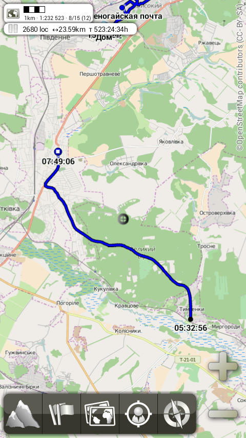 6 км лесного участка. Считать поселок нет смысла, т.к. эта часть не есть цель. Опять же, я давно езжу в Мерефу автобусами или машиной. От жд вокзала мотать километры до леса не вижу смысла. Так я могу вокруг дома походить. От Мерефы до Змиева лесом порядка 30 км. По трассе я ничего не считаю. Часть моих маршрутов я привел на карте. Можете посчитать расстояния в любой навигационной программе.