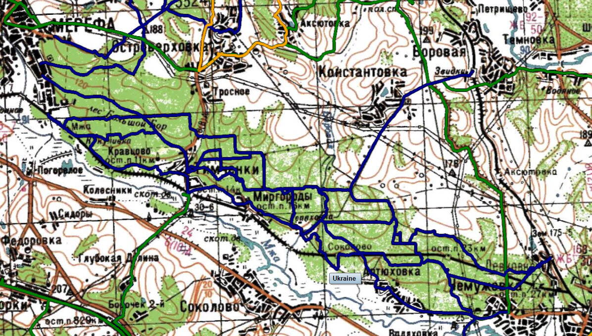 Некоторые возможные маршруты между Мерефой и Змиевом на карте. Пешие обозначены синим. Тем где трек "кривой" - или не было тропы или была охота и обходили номера.