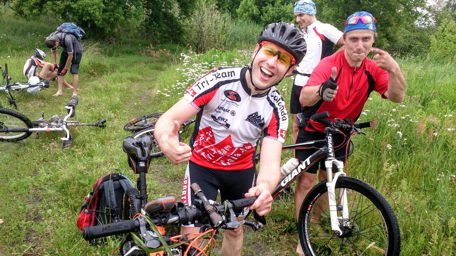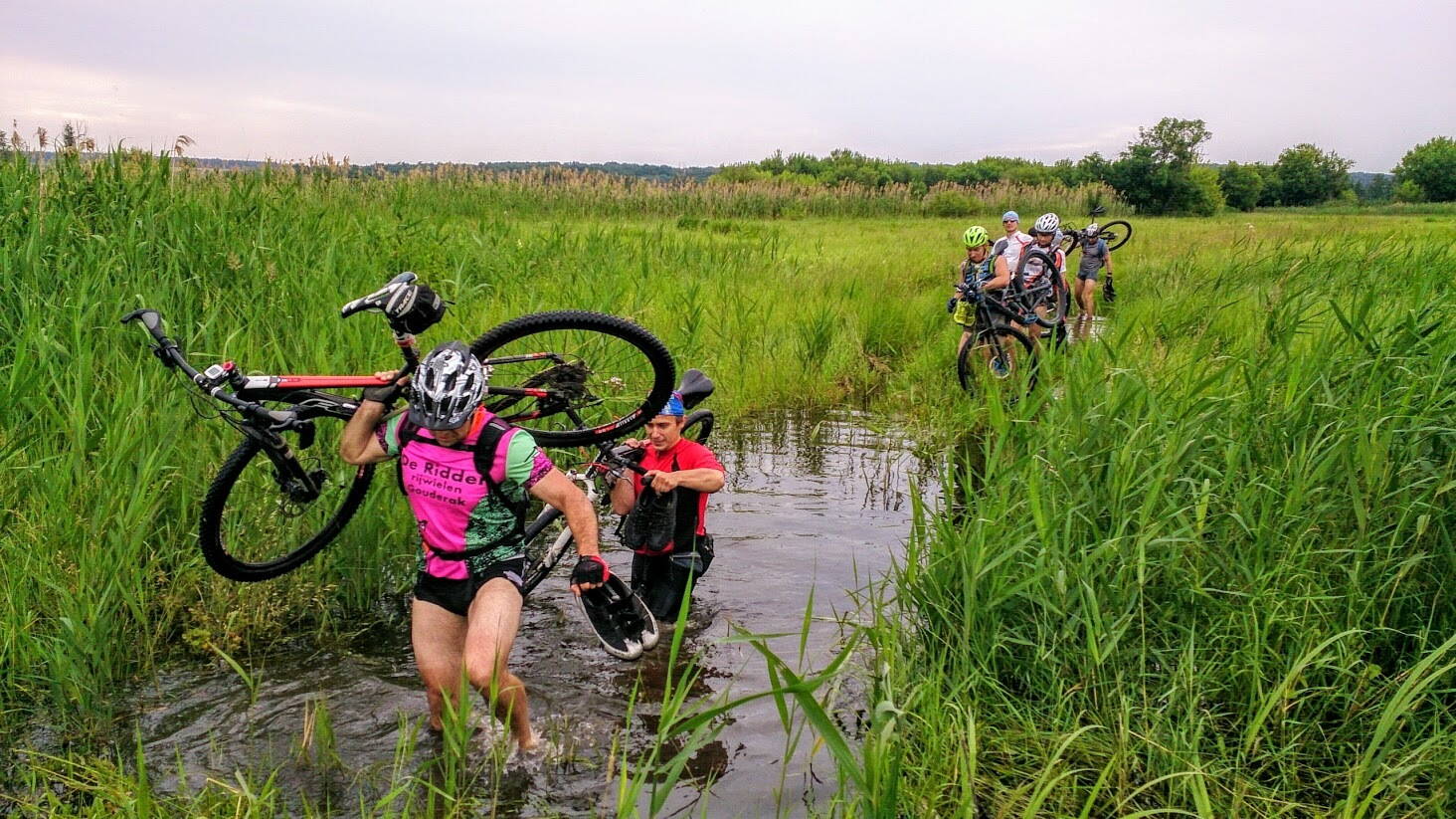 Покатушка удалась на славу, запомнится на всю жизнь :D ! Всем огромная благодарность за участие, спасибо что не привязали к велу и не притопили с ним там же на том заливном лугу между Гомольшанским лесом и Н.Бижкином. На броде №5 я уже сбился со счета после погружения в воду :plavec: со всеми приборами, рюкзаком и велом. Он не был завершающим как мы думали, это была середина только. Финальным сюрпризом на выезде из этого луга был брод длиной примерно 850 метров, воды по колено, местами глубже. Поиск оптимального и не очень глубокого пути, добавил к этому расстоянию еще прилично.