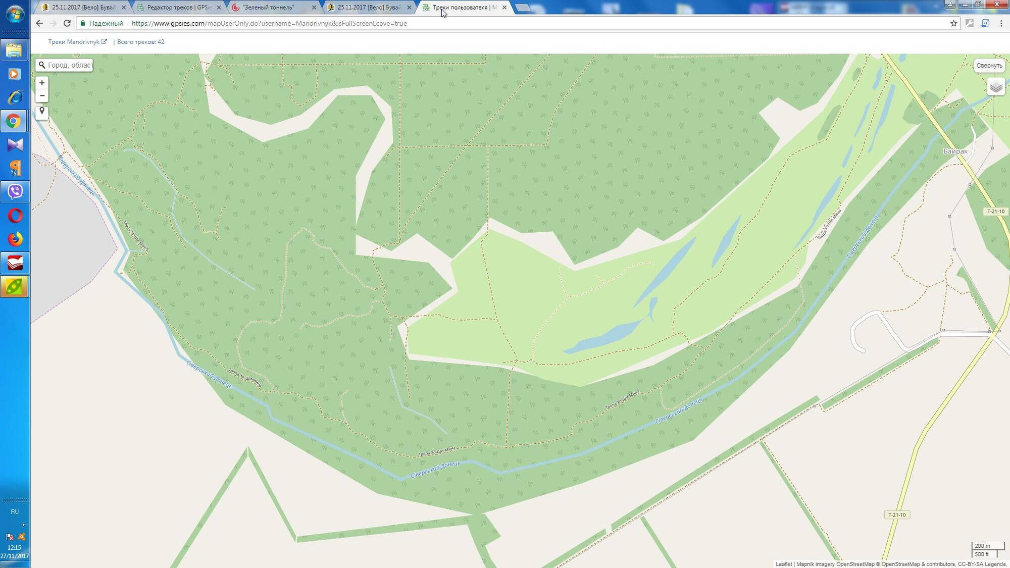 По тропе от Байрака до моста в Первомайском, о которой написал Мокрый supersergtur, и которую показал на карте Мандрівник, мы крайний раз ездили на Купаловской трёхсотке. Скоростных заездов, таких как на прекрасных лесных скоростных сингтрейлах между Ч. Гусаровкой и Байраком, там не получится. Тропа сильно заросшая по краям, нависающие со всех сторон ветки постоянно мешают ехать, приходится всё время отбиваться от них руками, и пригибаться к рулю. Как участок туристического маршрута будет интересна, как кантрийная трасса - нет!