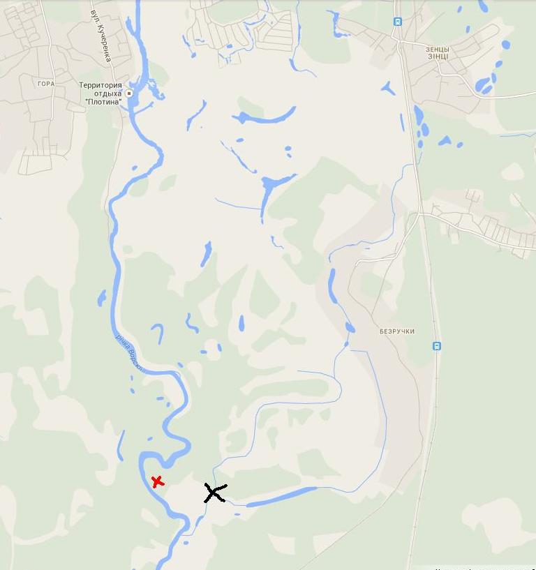 jamakasiНу прямо таки совсем безлюдных нет. Днем будет, наверно, много отдыхающих везде. Но хорошие места есть. Езжайте по левому берегу (если смотреть на твой рисунок, то по правому) вдоль реки и выбирайте где понравится. Хорошее место (красный крестик) в районе с.Безручки. Доезжаете до мостика из бетонных плит (черный крестик) и направо.От плотины можно ехать по дороге через лес. А прямо вдоль реки будет веселая тропинка, тогда сразу после леса выедете в то место.