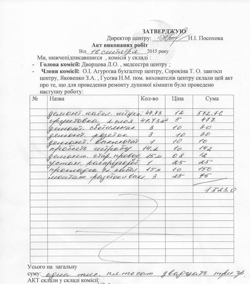 оплачено 1523,00 грн за ремонт потолка в СРЦ Ольховатка