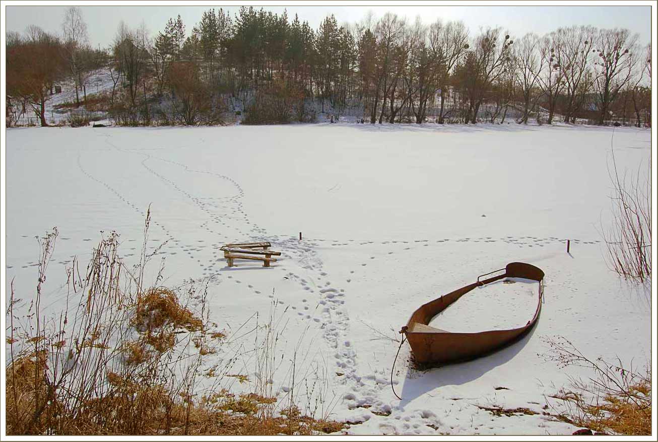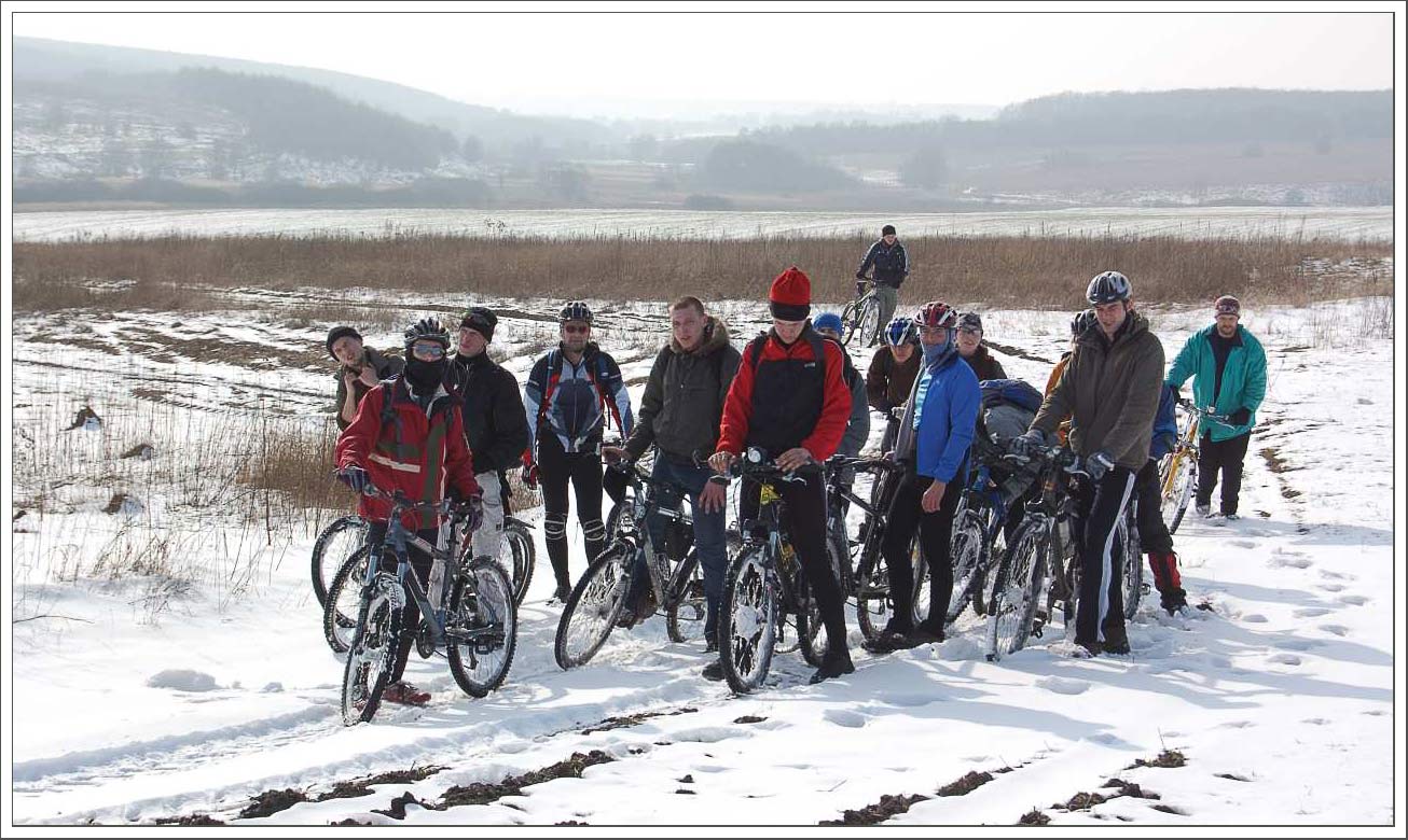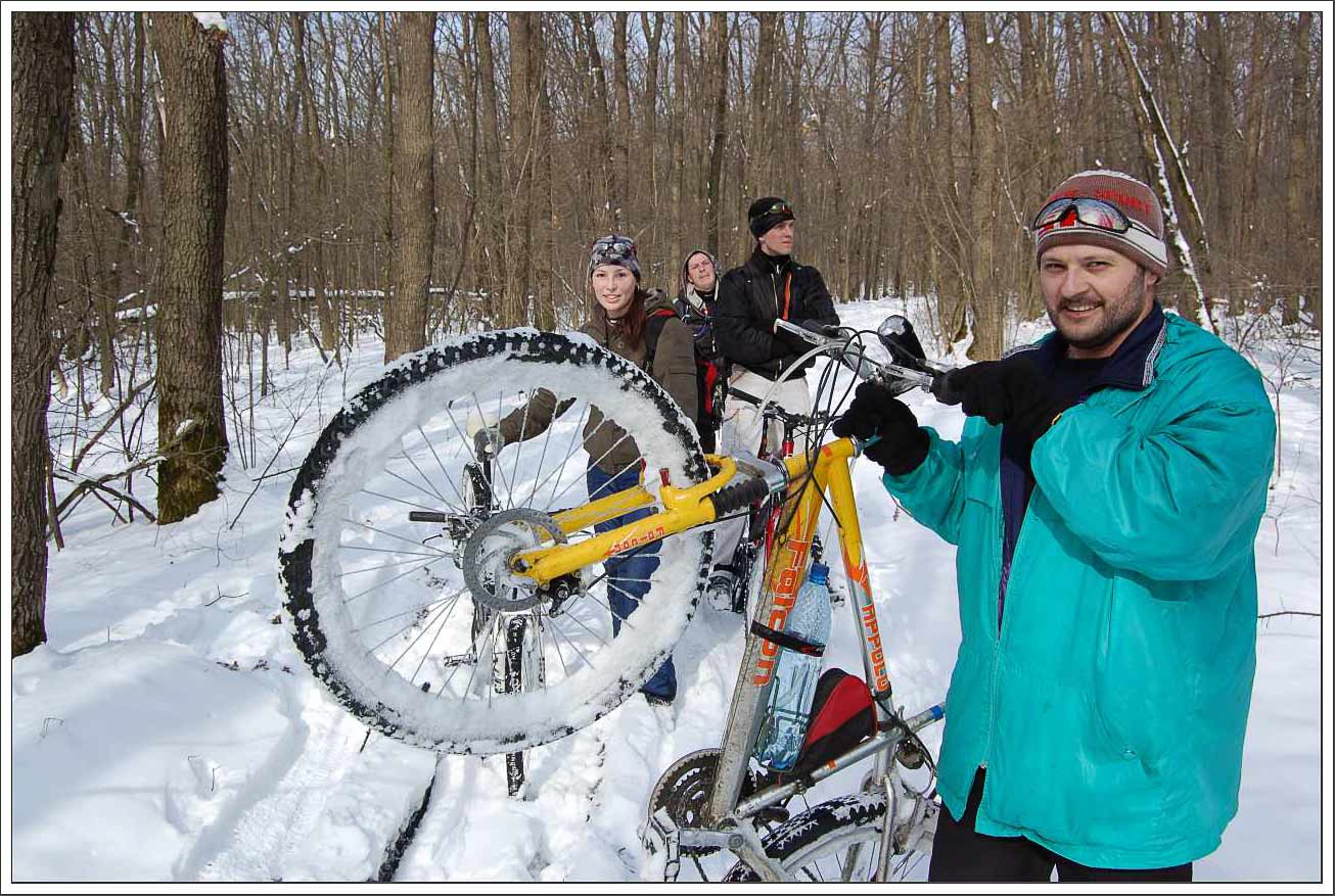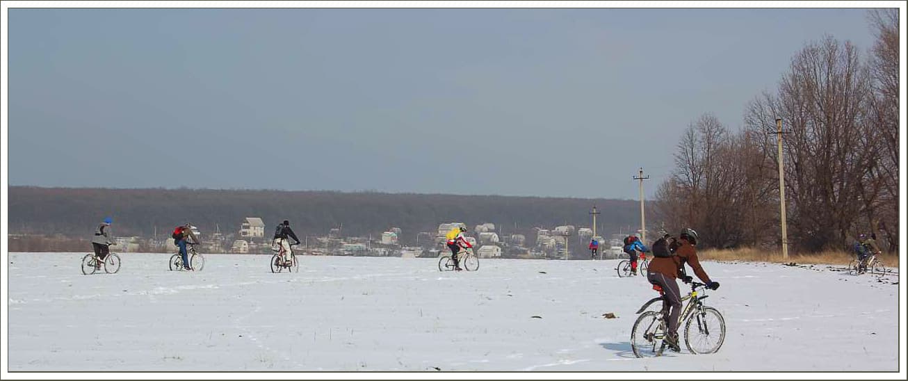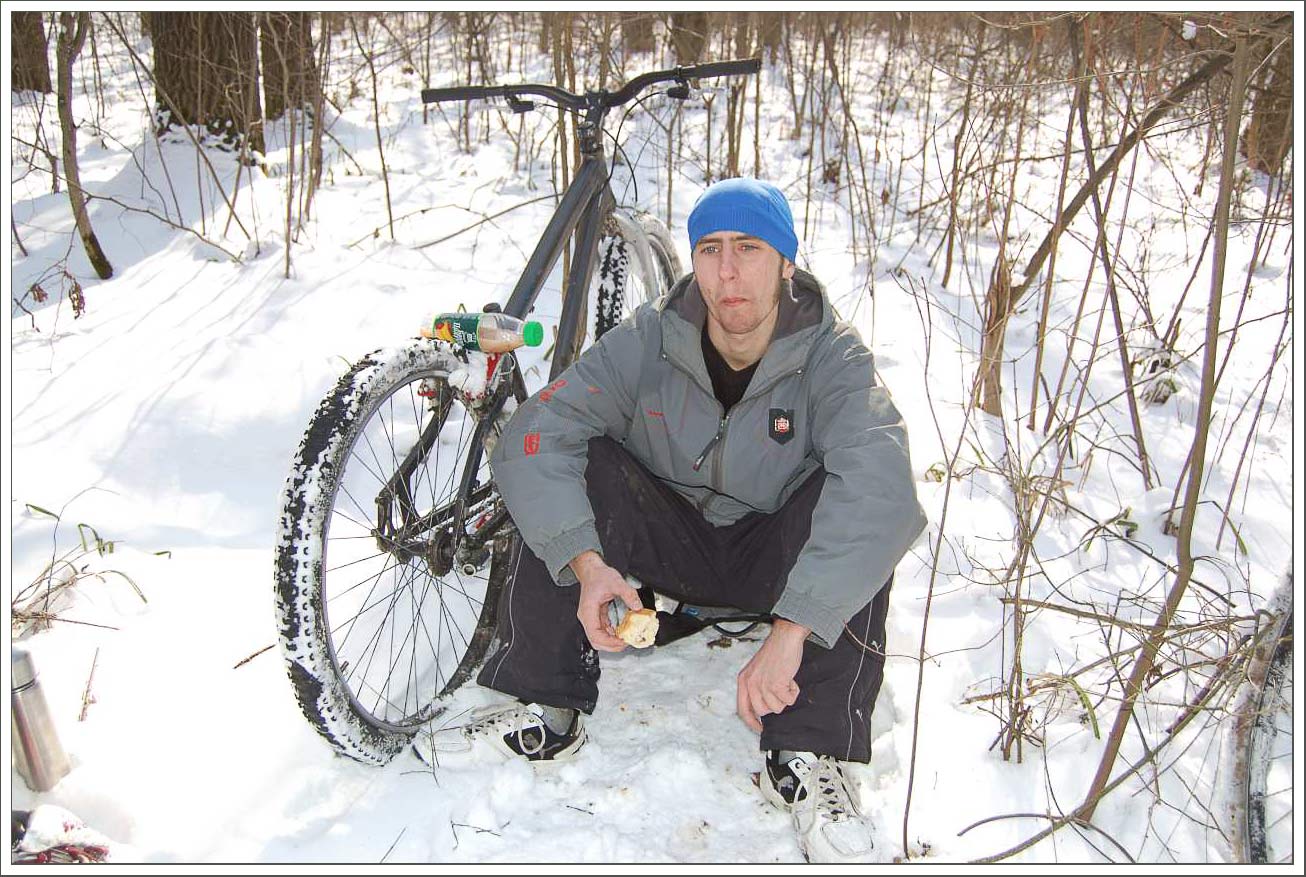 Последний день зимы нас встречал пасмурной погодой, но дороги были сухие, так что до места старта думаю все добрались быстро и чисто. Уже издали я увидел рюкзак Паши - без отличных фото не останемся :-) . А затем и показались остальные всадники металлических коней - все свои знакомые и друзья. Немного байкерских разговоров, что бы скоротать время до старта. Харьковское время 9:00, колонна велосипедистов трогается в путь. Еще сухой проспект Гагарина интригует двигаться быстрее - но скорость четко ограничена вышеуказанным темпом, за этим пристально следит начальник покатушки :-) . Сворачиваем к овоще фабрике или же ко всемизнакомой дороге к безлюдовским пляжам. Асфальт покрыт коркой льда - мы двигаемся осторожно, на этом участке все обошлось без падений. Приближаемся к озеру и тут моя цепь не выдерживает. (Что ж что поделать за последние три недели убеждаюсь что срам 991 полное фуфло.) Быстрый ремонт, стоит отметить помощь мохнатого ассистента :) , который не давал скучать остальной части команды, и мы снова в пути. Прокатились по льду безлюдовского озера, к счастью оно никого не приняло к себе в пучину. Двигаемся дальше, через жд и вьезжаем в лес. Лес встречает нас небольшим слоем снега, но все же это затрудняет движение, с этого момента Дима начинает наращивать темп, а вернее не дает ему упасть. Лес пахнет хвоей, чувствуется приближение весны. Ехать приятно. Скорость не дает мышлению заснуть, надо все время анализировать трассу иначе можно оказатся в обьятиях сосны :-) . Впереди колесо Димы, я не могу позволить себе отстать. Вот и Хорошево, перезжаем через Уды, двигаемся улочками Хорошево, которые приводят нас к подъему, на котором нам часто попадались ветки, загораживающие путь, но нас, смелых и отважных, такие мелочи не могут остановить. Упираемся в сад. тов., за шлагбаумом на нас смотрит сторож, у которго на лице написано, то же, что и думает шлагбаум :-): "Вам здесь нет прохода". Заснеженная тропинка - наш единственный выход. После нескольких минут вело таскания-ношения, мы садимся в седла, дальше можно ехать. Так мы плавно вьезжаем в Черный лес, в котором, со времени снегопада, кроме нескольких человек никого не было. Включаем легкие передачи и медленно но уверенно двигаемся навстречу приключениям, я вырываюсь немного вперед, позади уже не слышно голосов, я наслаждаюсь тишиной таинственного леса. После затяжного подъема делаем привал, что бы пополнить силы и подождать остальных. Кроме нас, по лесу рыскала и зелная нива, но ее колии были не достаточно твердыми что бы ехать по ним уверенно. Снова в бой с рыхлым и коварным снегом, который то и дело зарывает твой байк по самый переключатель. Андрей Борода на своем триальном веле чувствует себя лучше всех - его байк легчее всех проходит заснеженную трассу! Вскоре мы прощаемся с Черным Лесом и его тропами, двигаясь к следующей точке нашего маршрута - Александровке. Между Аксютовкой и Островерховкой на асфальте попадались очень скоростные участки, на которых было где оторваться. Далее двигаемся полями - на них уже подтаял снег и выглядывает чернозем, от этого вел и сам ездок постпенно чернеют :-) . Поля поражают своей красотой. Их безграничное пространство дают тебе чувство свободы и тебе хочется двигатся еще быстрее, приближая к себе горизонт! Плавно уходящие края полей сменяются лесами, особенно это эффект