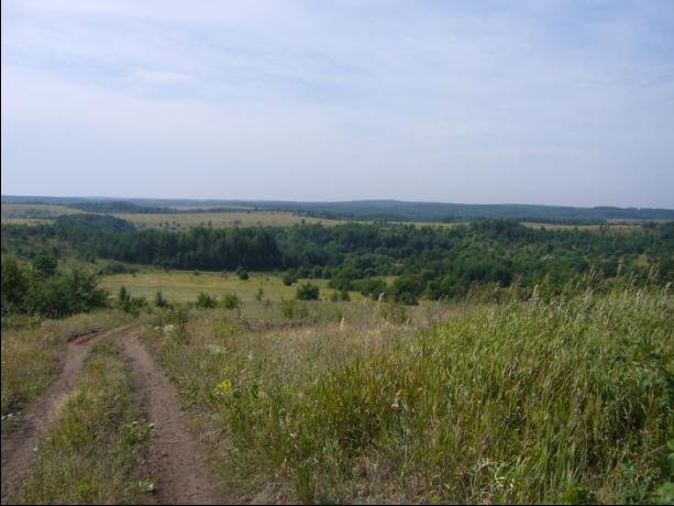 Этап 2 Терновая - Гатище Дистанция: около 35 км Уровень сложности: высокий. Магазинчик, где скупались товарищи находился на окраине деревушки и уже виднелась грунтовая дорога, уводящая мимо базы сельхозтехники через поля на север. Товарищи упаковались и мы продолжили движение. Грунты были сухие, местами даже раскатанными в песок. Это никоим образом не радовало Александра Даниловича на классическом советском шоссейнике без "горных" передач. Тем не менее, участок форсировался уверенно, Андрей вращал кривошип своего Бергамонта, потягивая воду из двухлитровой баклажки. Выглянуло и припекло солнышко, пейзажи вокруг нас менялись: поля сменились лесополосами и овражистыми урочищами, подъёмы чередовались со спусками, слева тянулась граница с Российской Федерацией. И вот, после очередного спуска, перед нами открылась обширная балка, поросшая хвойными деревьями и кустарником (фото см. ниже). Мы стали подниматься вверх, объезжая балку слева. Вскоре дорога увела нас в сторону, мы снова двигались вдоль границы. Так продолжалось до тех пор, пока дорогу нам не преградил лес. Мы были вынуждены свернуть вправо по едва заметной цепочке следов автомобиля, которая вновь приблизила нас к оврагу с хвойными деревьями. На краю балки мы остановились, любуясь пейзажем. Горизонт просматривался где-то не 6-7 км. После глотка воды и нескольких снимков мы начали спуск по грунтовой дороге вниз. Густая растительность по краям дороги представляла существенную помеху, цепляясь за рога на руле. Управляя одной рукой (второй пытался фотографировать), я чуть было не "моймал землю". На выезде из оврага нас поджидал очень резкий подъём, после которого дорога шла вдоль леса и дальше в поле. Перед очередной лесополосой мы сделали крутой поворот влево и понеслись вниз по спуску в очередной овраг. На этот раз дорога была широкой и хорошо накатанной. По пути встретили стадо коров из Старицы, после чего начали взбираться на следующий подъём с хорошим градусом. После этого подъёма дорога начала змеиться вокруг лесонасаждений и посадок. И вот, наконец, наш путь достиг того места, где грунтовка уходила в лес. На пути попадались брёвнышки и корни, дорога была сильно просажена грузовыми автомобилями. Последовал крутой спуск с поворотом влево, в лицо пахнуло сыростью и прохладой, а между стволами деревьев засверкали воды лесного озерца. Вдоль озера мы проследовали под тенью леса, после чего, выехав на луг, оставили лес и озеро позади и начали взбираться на подъём из поймы заливного луга. Снова мимо нас поплыли поля и купки деревьев. И вот мы выехали на поле, края которого терялись на горизонте. Некоторое время казалось, что мы крутим на месте, поскольку пейзаж не менялся. Однако, поле резко закончилось, упёршись в овраг, дорога повернула влево и пошла на спуск. Спуск был хороший и накатистый: 45+ км/ч. Сразу по его завершению, грунтовка уходила вправо и скрывалась в лесу за подъёмом. Между деревьев была широкая просека, которая быстро перешла в спуск, который вскоре покрыл щебень и битый кирпич. Так, цокоча зубами и матюкаясь себе под нос, мы вкатились в Огурцово. Недалече было и до Гатища. Там Андрей заправился водой и скушал мороженное, Александр Данилович купил бутылку "миргородской", а я не заправился водой, поскольку "прощёлкал" колодец . За Гатищем мы достигли контрольной точки: нача