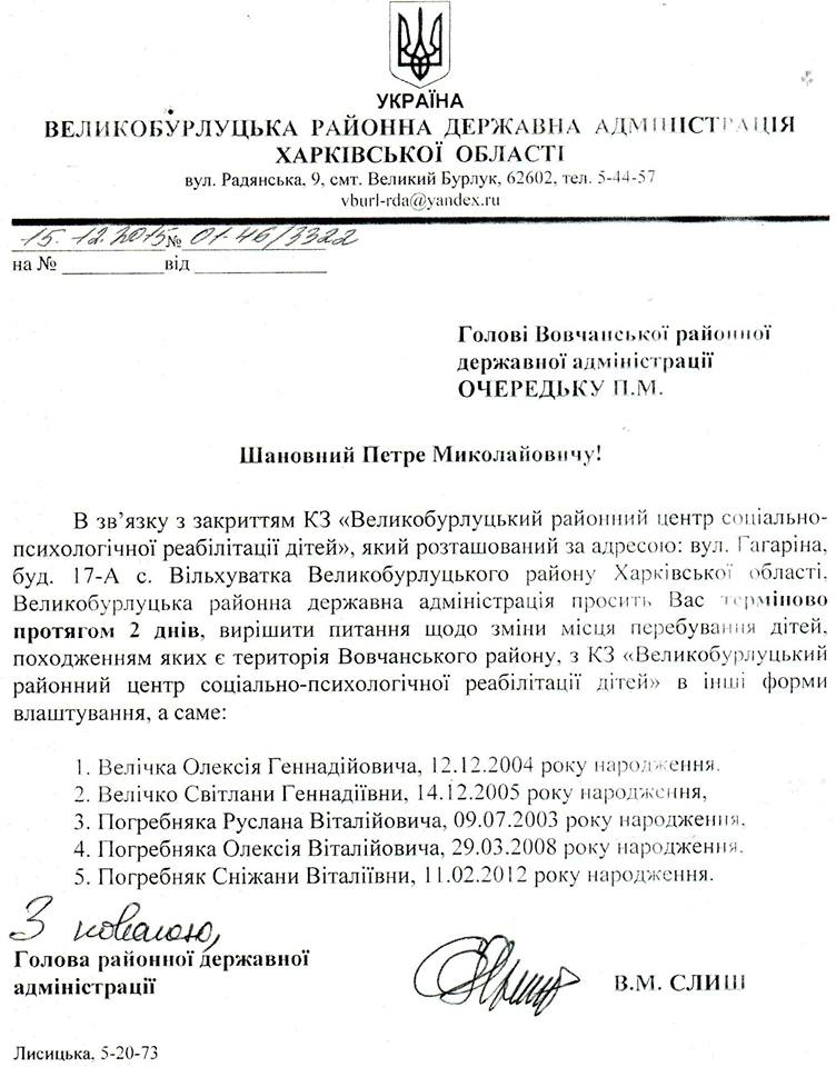 Тим часом голова райдержадміністрації Великобурлуцького району Слиш В.М. (https://www.facebook.com/viktor.slysh?fref=ts) почав розсилати по районам прохання забрати дітей із Центру, мотивуючи це «закриттям Центру» (копії документів додано).