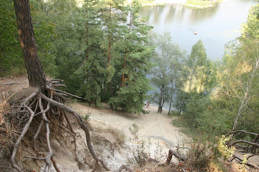 у меня где-то в альбоме есть фото (с реки) этого обрыва . Он намного круче был, сейчас его очень сильно размыло, с него можно спокойно спустится вниз .