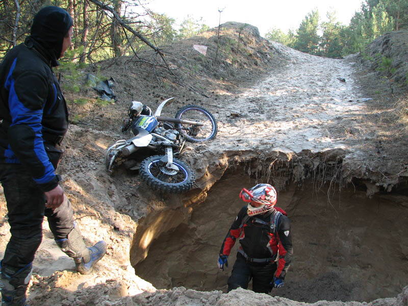 В лесу перед самой Башкировкой. :D Специально поехал по краю ямки. Переднее колесо прошло а заднее обвалило кромку обрыва. Мот сразу положил набок, чтобы не сползти задом в "пропасть" :D Тренируемся, короче.