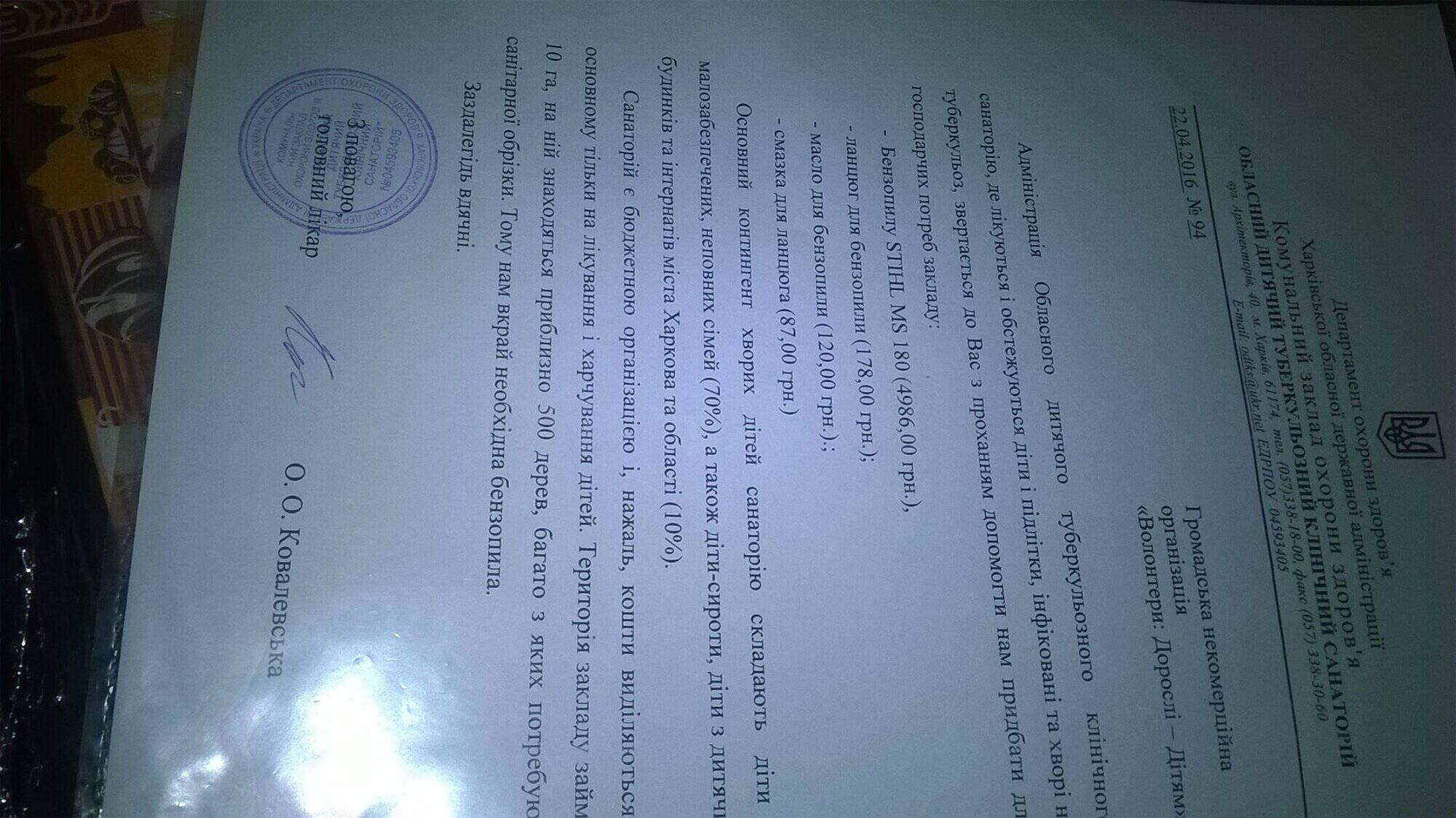 3) Купить в областной клинический туберкулезный санаторий бензопилу и все к ней (скан письма-просьбы прилагаю) - около 6000 грн
