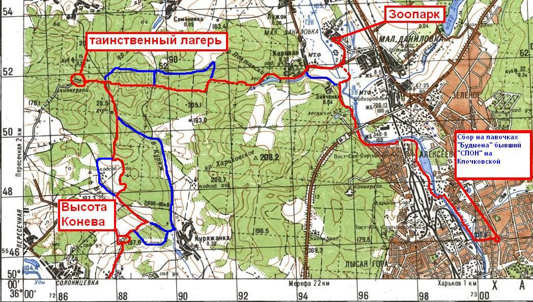 Маршрут: Вдоль Лопани в верх по течению - Зайченки - Зоопарк вет академии (проведаем как там страусы) - Караван - яр Полтавский - яр Долгий –« таинственный лагерь» - высота Конева - Солоницевка - далее либо "кто на харкив? я на Харкив ну на получи" :)), либо за лечебной водицей в Бермин воды, либо пикник... возможно все совместить все зависит от нас ;-)