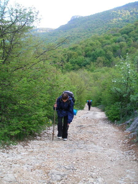 Если предполагается ночевка на Чайном домике, то лучше воду взять заранее. На подъеме, перед серпантином, вроде есть родник. А к самого чайного домика в пещере в прошлом году был такой мутняк... Пришлось у лесников выпрашивать, а на той - только варить.