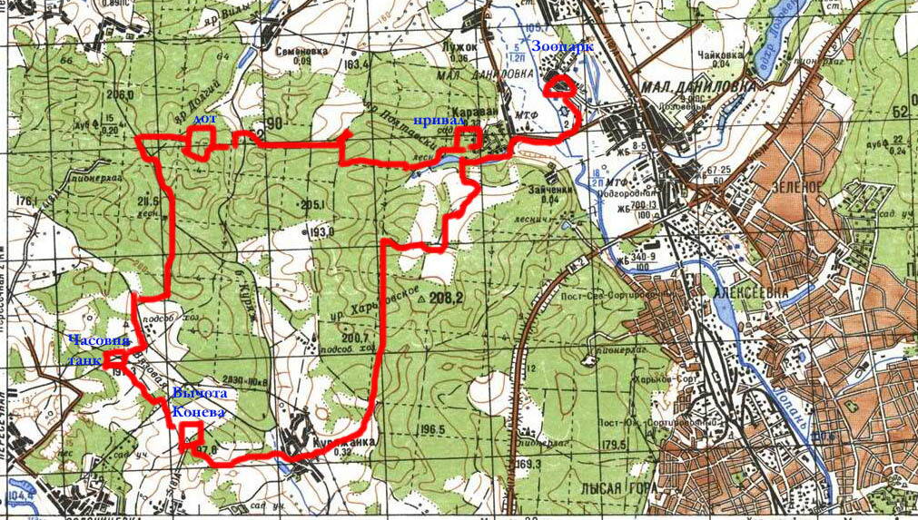 Старт в Каравене, возле страуса в зоопарке. Доезжаем до в. Конева. там гуляем, смотрим на Харьков. Дальше заезжаем на следующую высоту с танком и церковью .Возвращаемся лесом (в лагерь не заезжаем -собаки) пытаемся пролезть в заброшенный дот. Дальше привал на берегу озера. жарим сосиски и шашлык, купаемся, играем в бамбентон (я возьму)