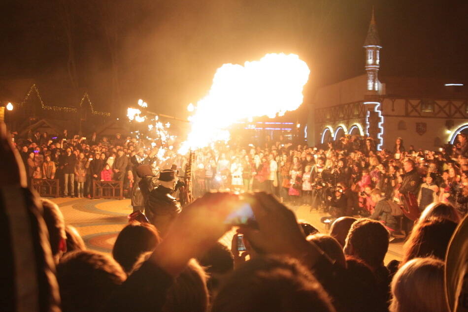 Зрителей ждёт 20 минутное огненно-пиротехническое шоу с массой пиротехнических спецэффектов, огнемётами, взрывающимися тыквами, фантастическими ручными орудиями стреляющими настоящими высотными фейерверками и огненно-барабанным шоу!