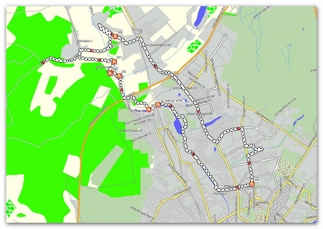 Маршрут: Метро Научная (МакДональдз) - ул. Шатилова дача - ул.Павловская - р.Лопань (левый берег) - пляж "Аркада" - завод "Комсомолец" - окружная дорога - наведение навесной переправы через р. Лопань - брод - с.Караван - озера - сгт. Малая Даниловка - Харьков - Саржин яр - парк Горького - метро Научная МакДональдз.