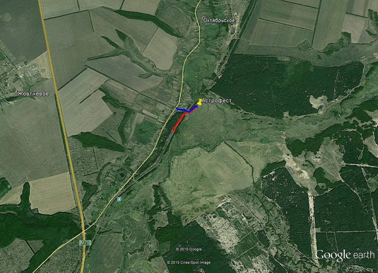 Красным - пеший маршрут от ж.д. остановки .Синим обозначена грунтовая дорога от асфальта. Асфальт, это дорога проходящая через село Октябрьское. Там надо повернуть на грунтовую дорогу и проехать под небольшим ж.д. мостом далее на луг.