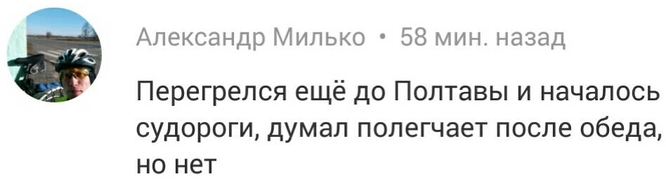 RJABCHUN Sergij уже под Полтавой, хочет успеть финишировать сегодня вечером. Говорит за всю поездку дремал три раза по пол часа!