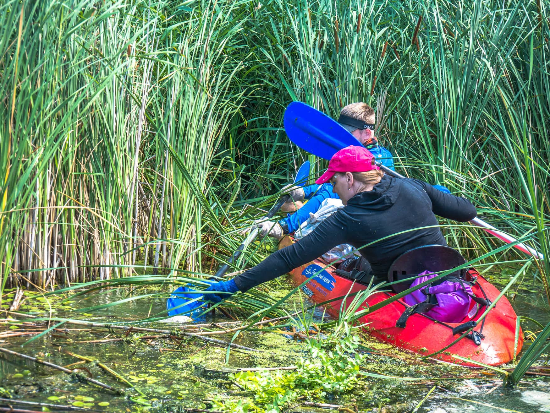 Лодки убирают по акватории (согласно своим зонам уборки – см. выданные карты), доставая из камышей всё, что смогут достать, и время от времени выходя из лодок, чтобы убрать валяющееся на берегу (тоже важно).