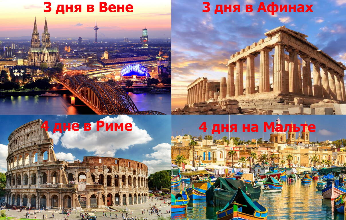 В Вене мы проведем 3 ночи, в Риме 4, на Мальте 4 и в Афинах 3.