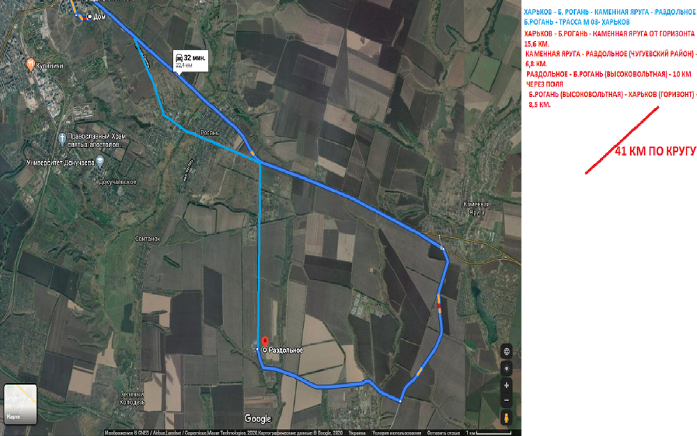 Маршрут: ХАРЬКОВ (ГОРИЗОНТ) - ТРАССА М03 - Б.РОГАНЬ - КАМЕННАЯ ЯРУГА (ПОВОРОТ НА НОВОПОКРОВКУ) - РАЗДОЛЬНОЕ - Б.РОГАНЬ (ВЫСОКОВОЛЬТНАЯ) - ХАРЬКОВ (ГОРИЗОНТ)