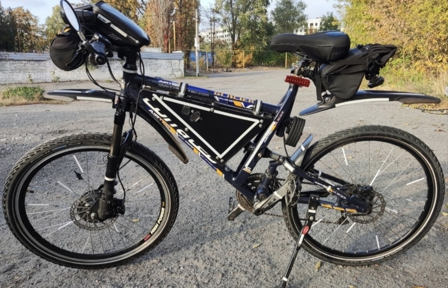 Электровелосипед собран на базе хорошего немецкого двухподвесного (это не обычная ашан-вилка и жёсткая пружина без регулировки сзади, а реально нормальная подвеска, которая действительно работает в любых условиях и значительно смягчает вибрации; с возможностью регулировки) велосипеда Corratec на воздушно-масляной подвеске с регулировкой. Все комплектующие качественные (оригинал). Все обслужено и смазано. Вилка переделана под мотор-колесо, стальные усиленные дропауты.