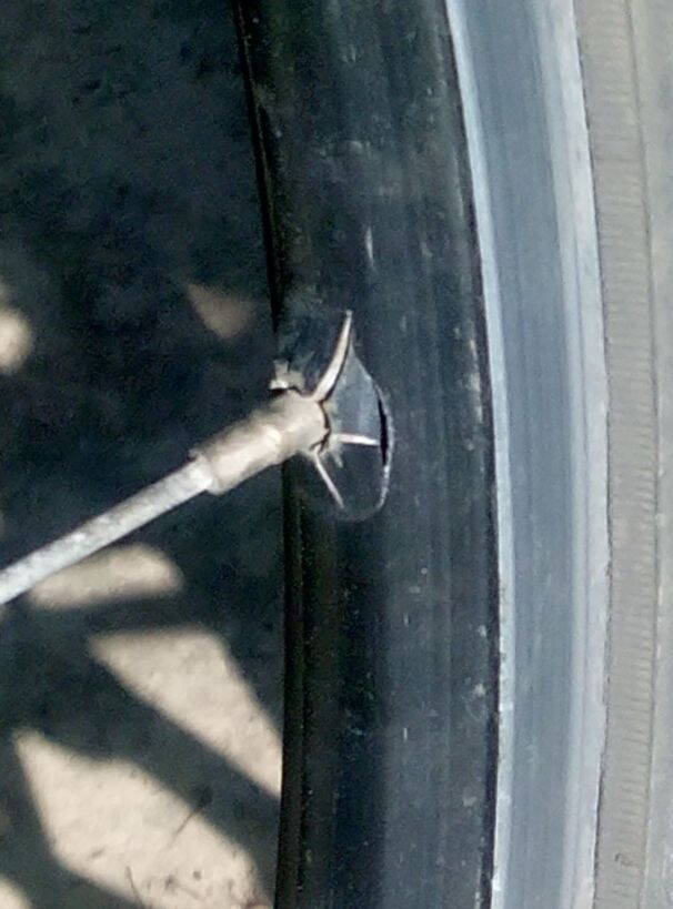 Уважаемые велогуру! Просветите и наставьте! Обод, прорванный спицей (фото