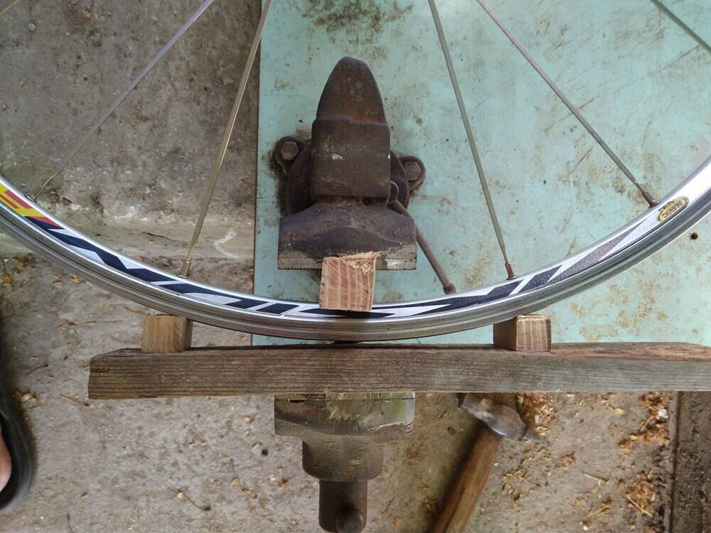 Вот было где-то видео со станком для правки ободьев. Не знаю как он называется поэтому найти не могу. Представляет собой две раздвижные лапы-бруса и рычаг сверху. И лапы и рычаг соединены концами в одной точке. Лапы раздвигаются горизонтально на нужное расстояние, а рычаг двигается вертикально и нажимает на обод установленный на лапы. Таким образом правятся и яйца и восьмёрки. В видео это всё выглядело очень ловко, легко, быстро и впечатляюще.