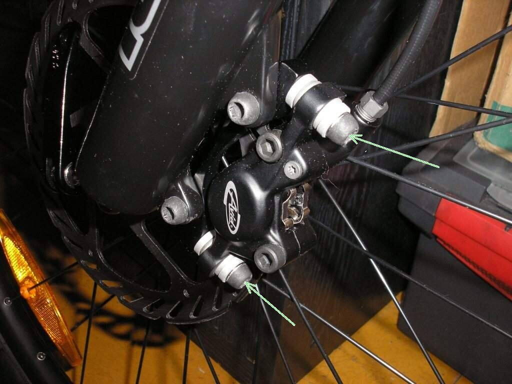 зеленые стрелки указывают на болты, которыми калипер крепится к адаптору через шайбы с шаровыми опорами, позволяющие изменять наклон калипера.