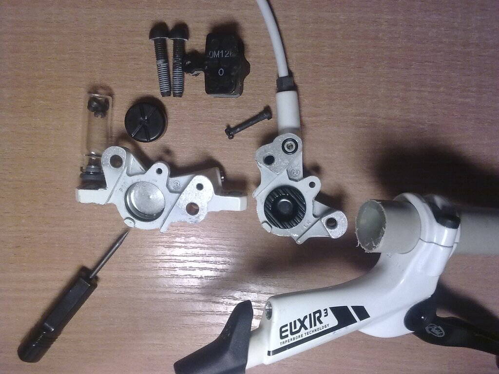Тормоз был прислан из Мариуполя с просьбой извлечь затянутые пробки прокачки с сорваными шлицами Torx T10 и сделать при неоюходимости новые. Собственно, хозяин нашел белые тормоза с белой же гидролинией, гармонирующие с его великом. Тормоза купил снятые с другого нового велика. Все какбудто должно хорошо работать и к заднему претензий никаких, а передний имел странно короткий ход ручки и постоянно чиркал по ротору колодками. Потому в него и лазили перекачивать, сорвав шлицы пробок.