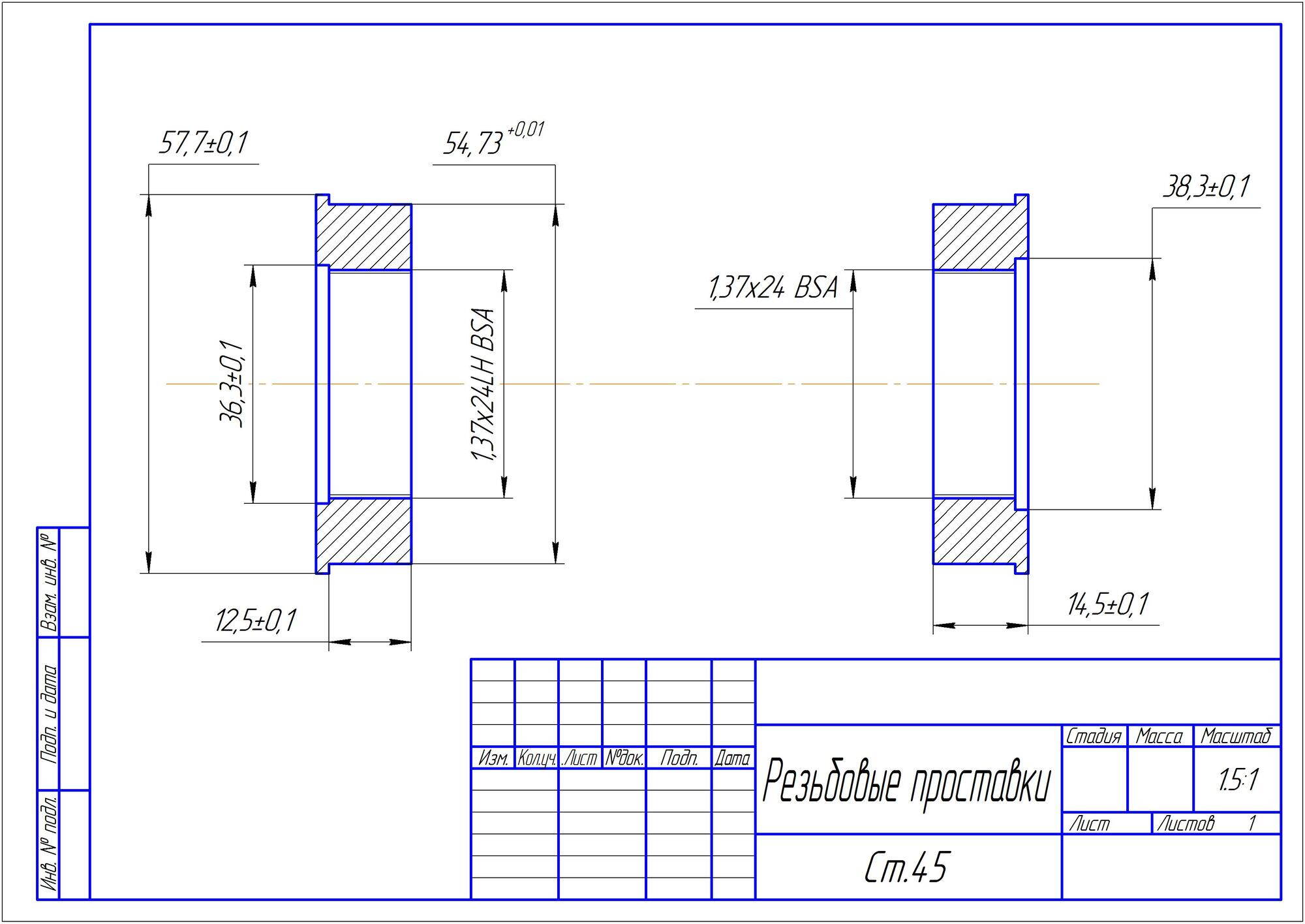 По быстрому набросал чертеж как делал бы я. Что на нем, надеюсь, понятно: внешний диаметр проставки = внутренний диаметр кареточного стакана+3...4 сотки натяга, внутри резьба 1.37х24 BSA, причем с правой стороны(со стороны звезд) она правая, с левой, соответственно, левая. Длина резьбы в проставке = 12.5 мм(себе так делал). Так же есть упорный бортик, дальше которого проставка не запрессуется в раму, ну и соответственно диаметр для посадки корпуса каретки для компенсации толщины этого бортика(размеры брал для BB-UN26). общая длина -14,5 мм(т.е. толщина бортика - 2 мм). Материал - ст. 45.