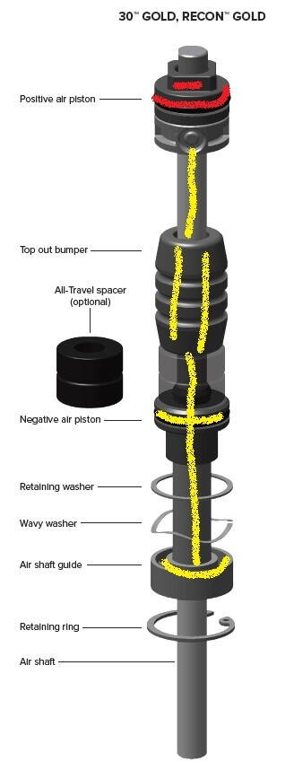 В воздушной камере с завода консистентная смазка была только на верхнем о-ринге (красным на рисунке); а в обратной камере сам поршень и все остальное было в жидком масле (желт. на рисунке)...