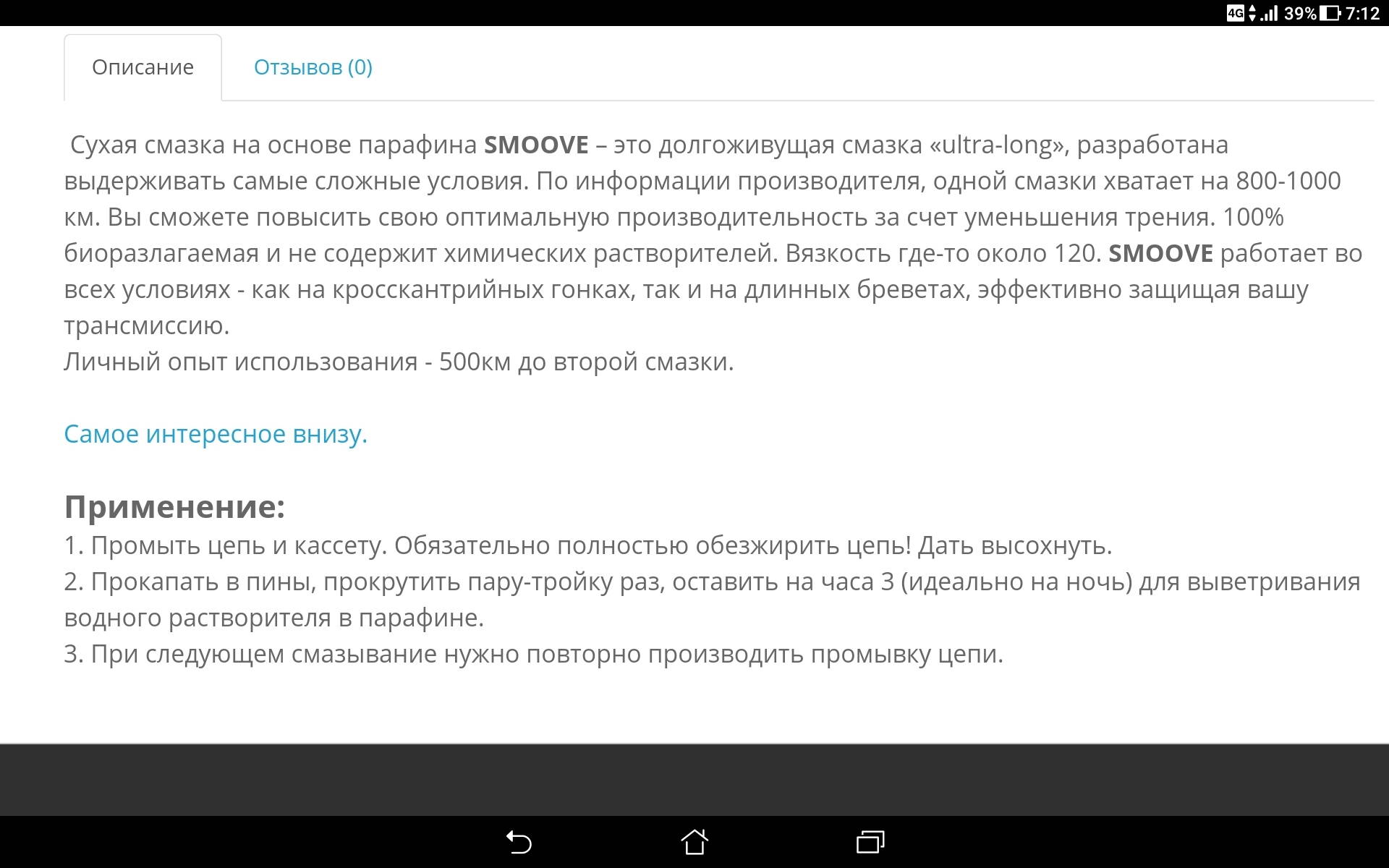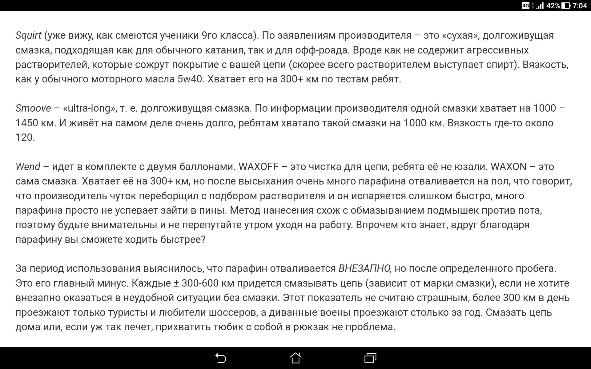 Для сравнения, Смув был куплен и рядом лежит. Попробуйте внимательно почитать сообщения - поверх воско-парафиновой смазки он вообще бесполезен, скатывается с цепи даже не пытаясь куда-то затечь. С почетом, под пиво, был отправлен на пенсию. В смысле на смазку переключателей, пружин и пр., там ему и место. И чтобы не казалось бла-бла-бла, следует внимательно читать сообщения, прежде чем отвечать в таком формате.