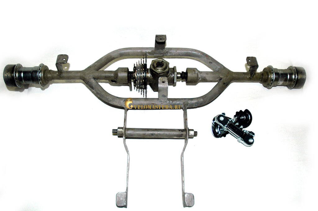 Задний мост производство ХВЗ имеет дифференциал, кассету на 6 передач. Выдерживает нагрузку до 130 кг