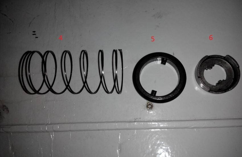 Прошу помощи в сборке втулки, так получилось что пришлось разобрать полностью планетарный механизм и теперь не могу собрать. На первом снимке я указал стрелкой на пружину, дальше за пружиной идёт деталь 1 с фото №2 и потом последовательно 2 и 3 детали, на 3 детали так же есть пружина. Дальше идёт пружина 4 с фото 3, она упирается в деталь 1 (фото 1) и накрывается деталью 5 (фото 3) и потом в пазы детали 5 (фото 3) вставляется деталь 6 (фото 3). И на сколько я помню эти все детали фиксируются и не выскакивают, у меня же при сборке пружина 4 (фото 3) выталкивает 5 и 6 детали. Я пересмотрел много видео по сборке этой втулке, но именно механизм с пружинами не разу ни кто не разбирал, по крайней мере ни кто не выложил такого видео.