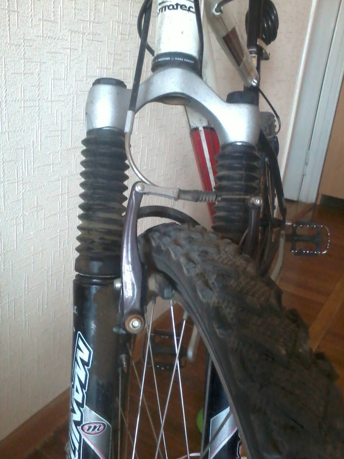 Это уже не есть хорошо - по-хорошему надобно поменять сальники. Если, конечно, удастся найти подходящие. Пока идет процесс поиска новых сальников самое главное что можно и обязательно нужно делать - постоянно вытирать ноги и штаны от масла, чтобы туда не успевала налипать пыль и грязь. Ещё можно попробовать зафиксировать резиновый пыльник-гофру так, чтобы он не мог приподниматься от штанов и стоял на штанах без зазора. Так будет меньше вероятность попадания в вилку грязи через изношенный сальник. Самый простой вариант фиксации гофры - аккуратно примотать черной изолентой. Сразу скажу - на практике этого делать не приходилось, поэтому, возможно, нужно будет помудрить другой вариант фиксации пыльника.