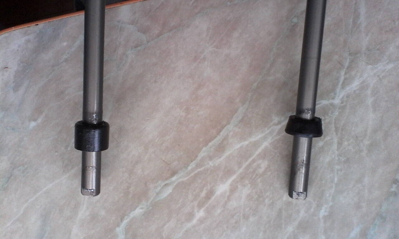 В середині ноги ковзають на двох штирях, впираючись на них через пластикові втулки. Матеріал втулок - щось на подобі карболіту, але не крихкий, а пластичний, типу ебоніту, але твердіший. Верхня втулка, та, яка прикручена нерухомо до штиря, майже немає зносу, щільно ковзає по внутрішній поверхні ноги. Нижня втулка, на, яка нерухомо закріплена на нозі і ковзає по зовнішній поверхні штиря, мала велику виробітку, тобто діаметр отвору був більший від діаметру штиря десь на 1,5 мм. При оцінці впливу перекосу ноги в штанині дійшов до висновку, до 1,5 мм - це надто багато. Виточив нові, з капролону. Нові втулки щільно ковзають (без зусилля) по штирю.