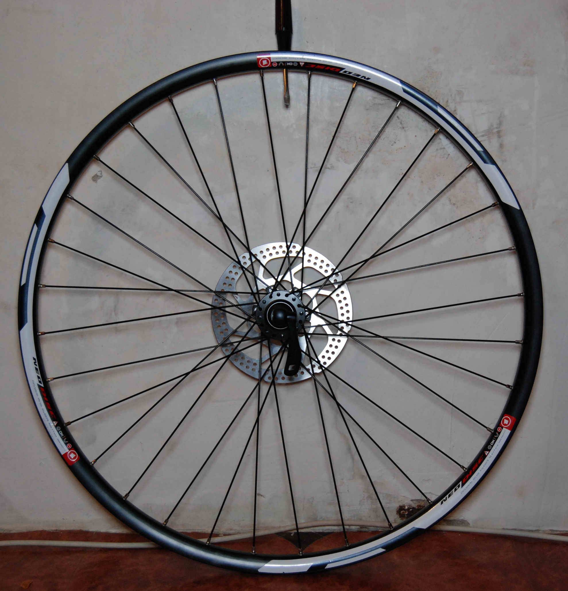 Собрано оно в 2 и 3 креста (3 со стороны диска), шильдык на втулке через дырку не видно, вентиль по моему не на месте т.к. можно было бы его поместить между расходящихся спиц (во всяком случае так были собраны все колёса которые я видел в своей жизни).