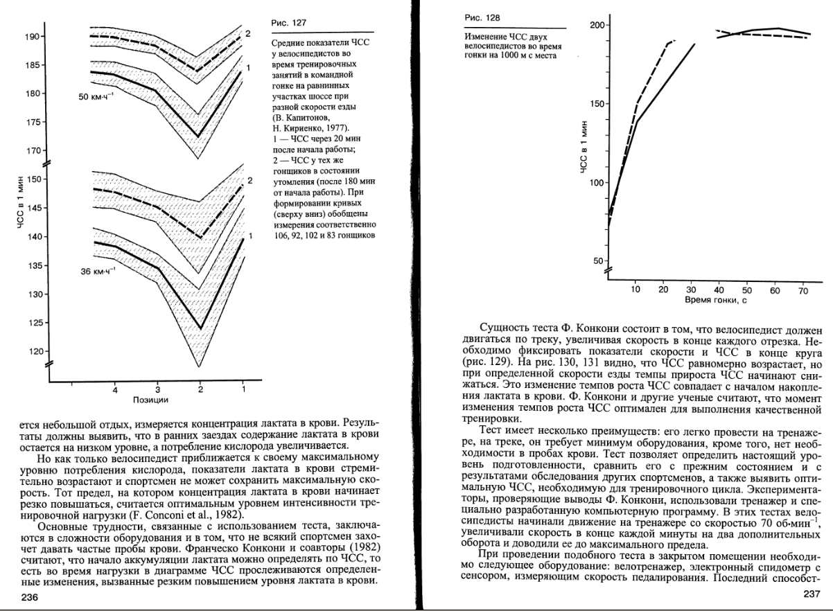 Про эффект Конкони написано в книге "Велосипедный спорт" Д.А,Полищук например на стр. 237 (смотри приложенные скрины) А так же выдержка из Журнала "Лыжный Спорт" Виктор Селуянов: СЕРДЦЕ – НЕ МАШИНА… : "У него начальная прямая графика будет продолжаться до пульса порядка 170-180, а затем начнет даже загибаться вправо от прямой. Выше 180-190 пульс просто не растет. Почему это происходит? Из-за того, что у спортсмена много ОМВ, закисление мышц, которое начинается в оставшихся гликолитических МВ, слишком мало. Сердечно-сосудистая система уже имеет слишком большое возбуждение из-за того, что большая мощность работы выполняется, мышцы сокращаются с очень большой силой. И сердце на такое слабое закисление просто не реагирует. Поэтому рекрутирование дополнительных двигательных единиц не приводит к росту ЧСС. Точку перегиба на таком графике (см. рис. 1, точка B) часто называют точкой Конкони, и связывают с АнП. На самом деле эффект Конкони никакой связи с АнП не имеет и, к сожалению, вошёл в практику спорта безо всяких на то оснований. Дело в том, что Конкони проводил свои исследования на квалифицированных бегунах, у которых подготовка была на уровне КМС и МС. Что такое бегун уровня МС — это человек, у которого неразвитые мышцы, а АнП практически равен МПК. Поэтому, как только он включил все свои ОМВ, а гликолитических у него очень мало, сердце больше не возбуждается, пульс при этом 170 -180 уд/мин. Чтобы сердце вышло на пульс 210-240, нужно очень сильно человека закислить, а эти люди не могут закислиться. Их сердце перестаёт увеличивать ЧСС, они еще две ступеньки лишние отработают и говорят: "всё, отказываюсь от работы, мышцы не тянут". А у спортсменов, имеющих хорошее сердце и неподготовленные мышцы, эффект Конкони не наблюдается, у них нет такого явления. У спортсменов, имеющих много ГМВ, пульс начинает расти вверх, никаких переломов и западений вниз нет. У 80% спортсменов эффект Конкони наблюдается, и точка Конкони даже совпадает с АнП, а у 20% либо она вообще отсутствует, либо нет никакого совпадения. В связи с тем, что на графике теста неподготовленного спортсмена нет эффекта Конкони, а АнП есть, то явление не воспроизводится, а значит, те причины, на которых это явление теоретически основывается, отсутствуют. Логика такая: если есть эффект Конкони, то есть АнП, есть 4 ммоль/л лактата. Где здесь это? Вообще нет никакого перелома, всё идет только вверх (см. рис. 1, красная сплошная линия). Отсюда вывод: эффекта Конкони не существует в природе, есть некто Конкони, который что-то увидел, обозвал это своим именем, приписал несуществующую в природе взаимосвязь. "