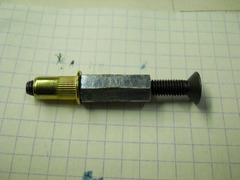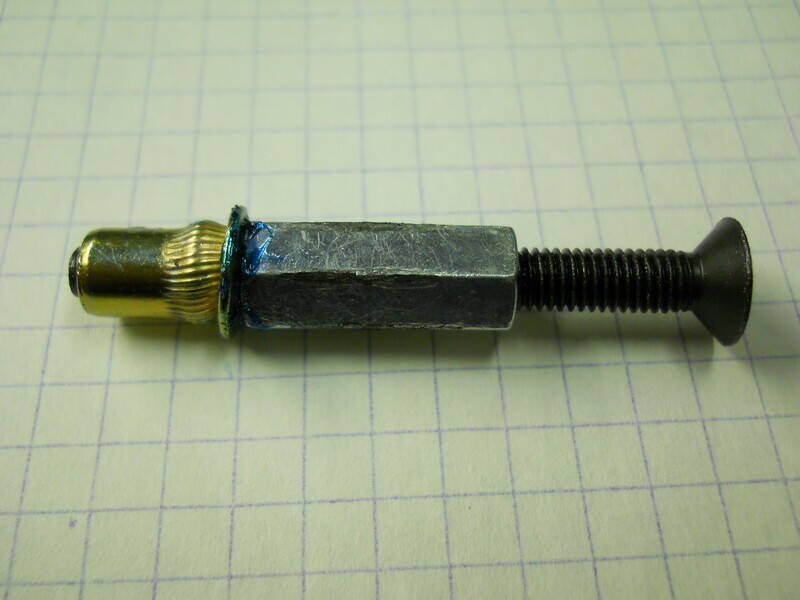 Но что я хотел рассказать - когда-то, в одном специфическом немецком оборудовании мне встретились резьбовые заклепки, расклепываемые без инструмента, можно попытаться повторить такой фокус. Попытаюсь описать: покупаете резьбовые заклепки (с запасом, для экспериментов), берем заведомо более длинный болт с соответствующей резьбой, на болт сначала наворачиваем гайку, потом шайбу, потом заклёпку. Вставив всё это дело в отверстие болтом необходимо прижать заклёпку, чтобы не вылезла и одновременно удерживая болт от вращения начинаем скручивать с него гайку. Упершись через шайбу в головку заклёпки гайка потянет болт вверх, соответственно болт вытянет резьбовую часть заклёпки и расклепает её с другой стороны отверстия. Надеюсь у вас получится это представить, рисовать очень лень.